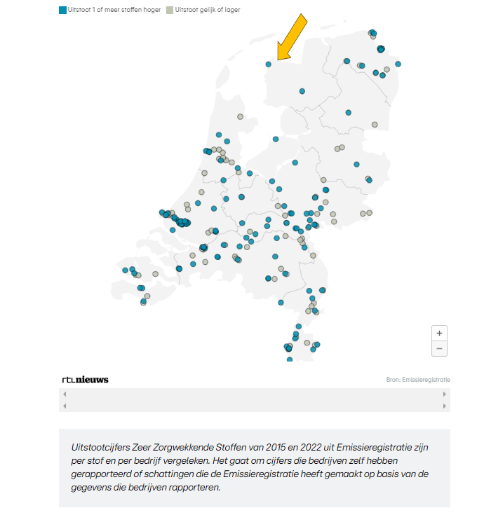 Onderzoeksjournalisten van RTL Nieuws hebben de uitstoot cijfers van ZEER ZORGWEKKENDE stoffen (ZZS) van onder andere de REC over de jaren 2015 en 2022 met elkaar vergeleken. ZZS zijn zéér giftig en de de inname van ZZS kan op termijn onder andere een trigger vormen voor de vorming van kanker. Uit onderstaande kaartje blijkt dat de niet alleen pal naast de UNESCO Wereldergoed NATURA 2000 Waddenzee, maar ook de vlak bij de stad Harlingen en omliggende woonkernen gelegen afvalverbrander REC op de ZWARTE LIJST staat.
