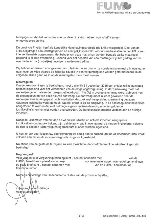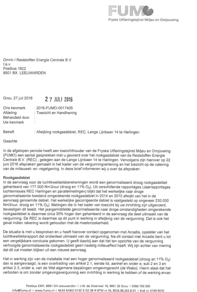 Uit een eerder door de SAN ingediend Woo verzoek (Wet openheid overheid) is een interne FUMO-brief boven tafel gekomen. Uit die brief blijkt dat de toezichthouder zelf al in 2016 tot de conclusie gekomen was dat de afvaloven gemiddeld circa 230.000 Nm³ rookgas per uur uitstootte. Dat is zo’n 30 procent boven het vergunde niveau. De adjunct-directeur van destijds noemde het expliciet als een voortdurende overtreding van de milieuwetgeving. Echter: een actief en uitvoerend handhavend optreden bleef uit. Opvallend hierbij is dat de betreffende adjunct-directeur kort daarna op ‘een functie elders’ terecht is gekomen.