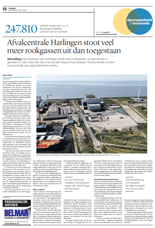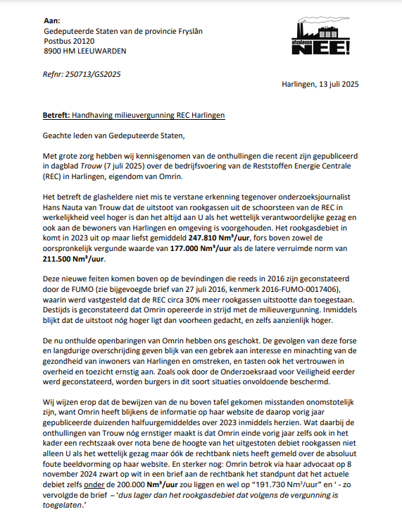Harlingen– De provincie Fryslân heeft jarenlang toegestaan dat de Reststoffen Energie Centrale (REC) in Harlingen structureel en fors méér rookgassen uitstootte dan vergund. Dat blijkt uit documenten van toezichthouder FUMO en recente verklaringen van de afvaloven zelf. Stichting Afvaloven Nee (SAN) eist nu onmiddellijke intrekking van de vergunning en directe stillegging van de installatie.