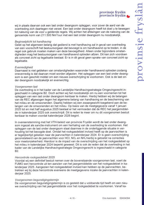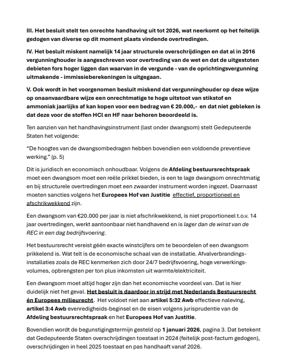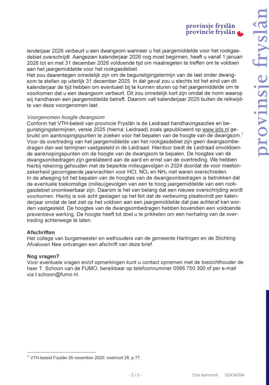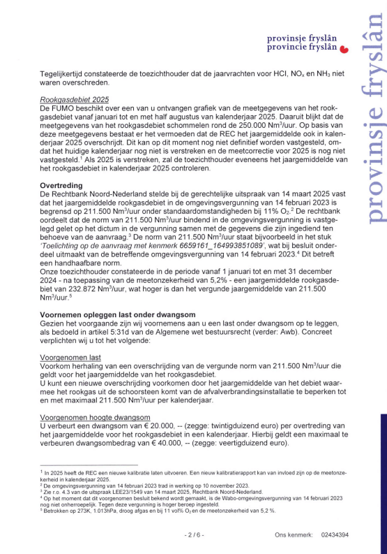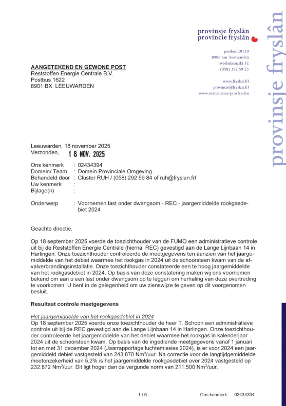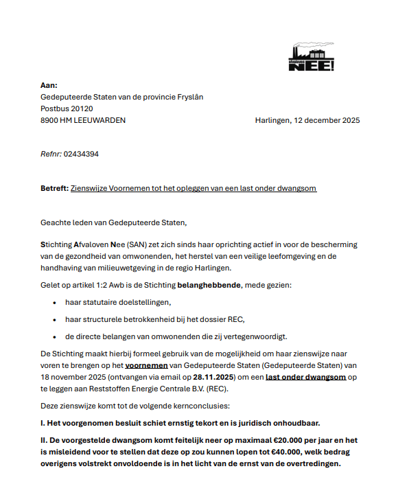 We hebben op 12.12.2025 een Zienswijze ingediend tegen het Voornemen van de Provincie Friesland om een Last onder Dwangsom op te leggen aan de Reststoffen Energie Centrale. Dit is een normale stap in het hele proces naar weer een andere rechtszaak. We blijven echter onverstoord doorwerken aan onze andere insteek, namelijk het Openbaar Ministerie. Daar maken we vorderingen mee en we houden jullie op de hoogte. Hieronder eerst onze brief die vandaag naar Gedeputeerde Staten is verstuurd.